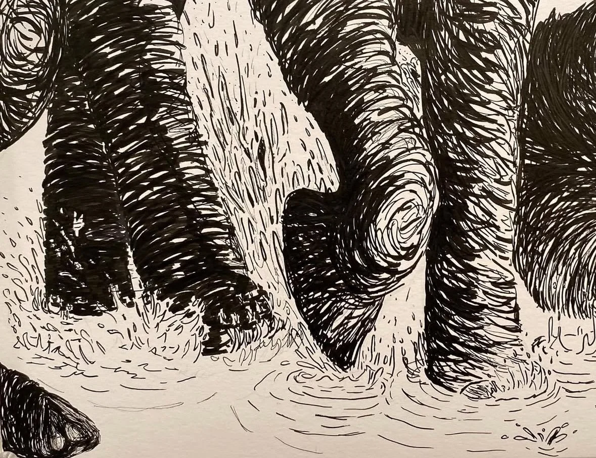 Elephants is a study in line work, focusing on how form and texture can emerge through movement and repetition of line. For my subject, I chose a baby elephant splashing through puddles amid a herd of older elephants. Rather than relying on defined outlines, I allowed the density and direction of my lines to naturally shape the figures and convey depth. The fine, overlapping strokes not only formed the elephants’ bodies but also mimicked the intricate, wrinkled texture of their skin. The splashing water adds a sense of energy to the composition, while filling the negative space and grounding the scene in a moment of playful youth.