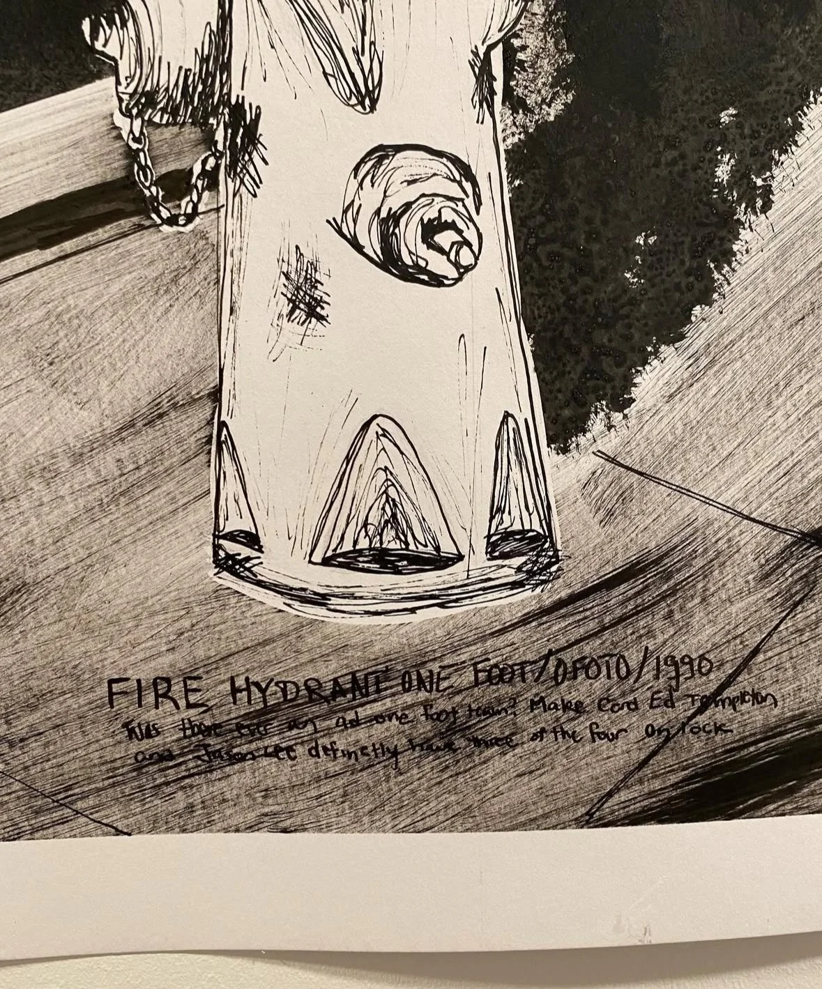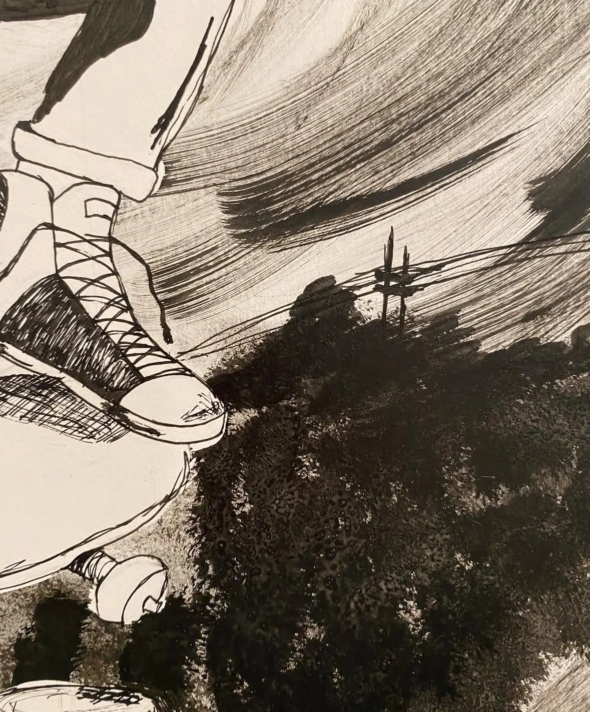 Fire Hydrant One Foot is a study in forced perspective and motion. I chose to recreate a photo of skateboarder Jason Lee performing an ollie one foot over a fire hydrant, originally captured with a fisheye lens. The lens distortion added a dynamic sense of depth, which I aimed to emulate in my piece by curving the background elements, such as the sidewalk, buildings, and power lines, to mirror that warped perspective. To heighten the illusion of motion, I had Jason’s front foot break through the frame’s boundary, pulling the viewer into the action and creating a strong focal piece within the motion of the composition.